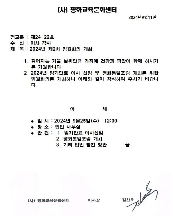 법인회의실에서 임기만료 이사선임 및 46차평화통일포럼 개최를 위한 임원회의가 예정되어 있으니