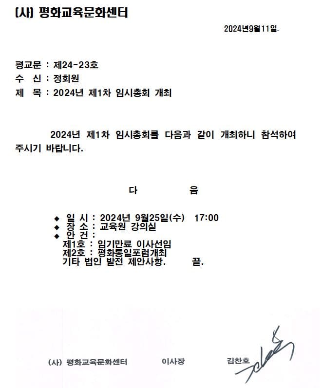 임기만료 이사선임 및 46차평화통일포럼 개최를 위한 임원회의가 예정되어 있으니