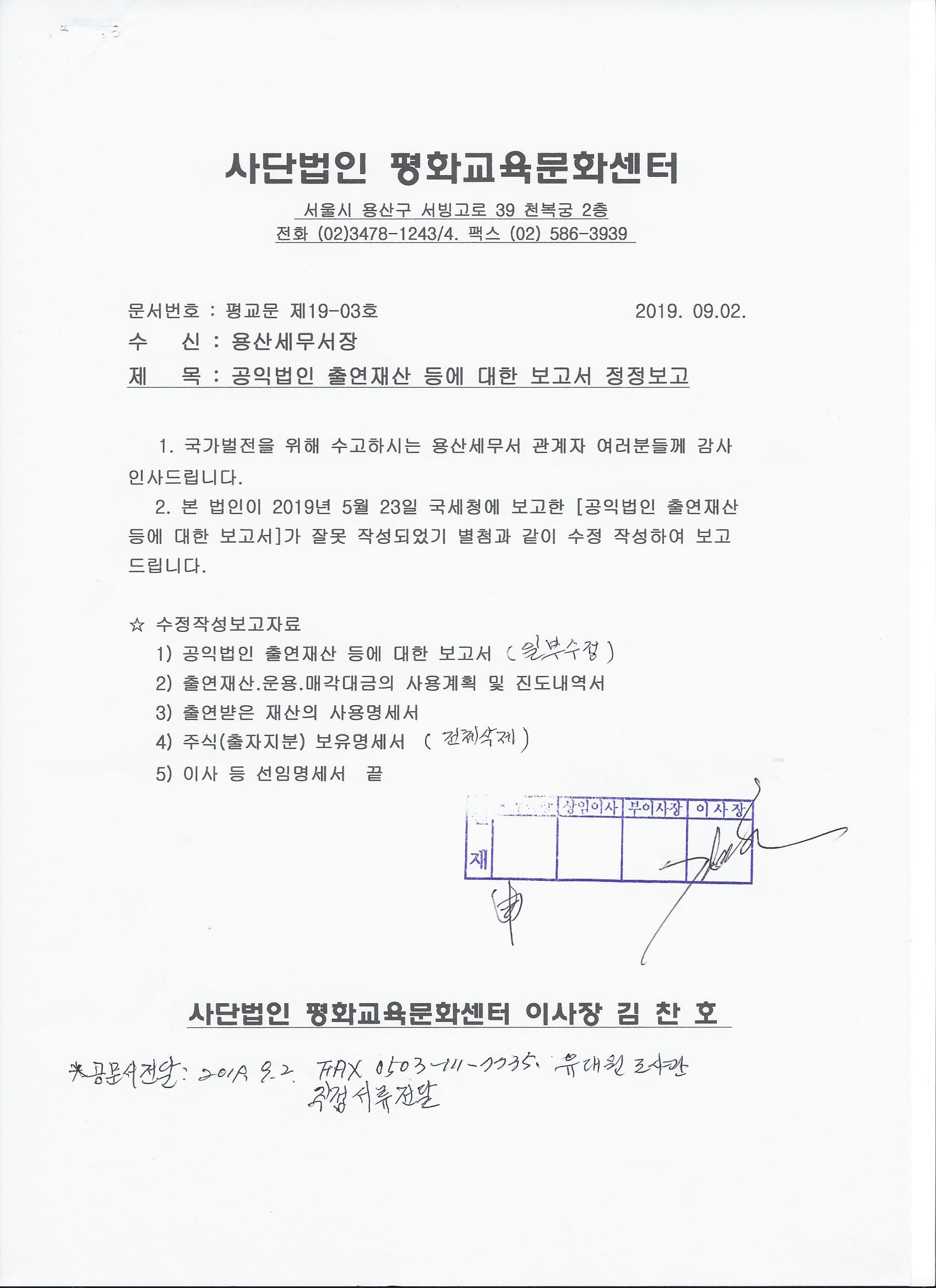 본 법인이 2019년 5월 23일 국세청에 보고한 [공익법인 출연재산 등에 대헌 보고서]가 잘못 작성되었기 별첨과 같이 수정 작성하여 보고 드립니다
